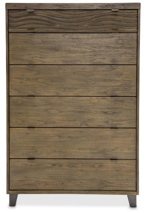 AICOCrossings Collection by Aico Furniture Reclaimed Barn finish Constructed using Acacia wood solids Metal hardware and pipe accents are in a gunme...