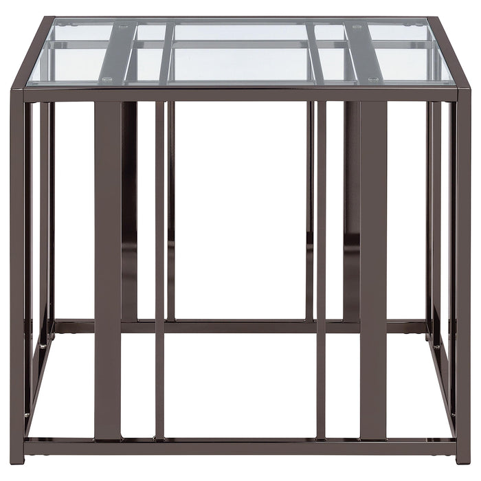 This modern side table features a tempered glass top paired with a geometric base in heavy-gauge metal with a sleek black nickel electroplated finish. The open design offers a contemporary aesthetic, blending elegance with durability. Perfect for displaying decor or keeping essentials within reach, its scratch-resistant materials ensure lasting quality. The compact design makes it a versatile addition to any living room or small space.