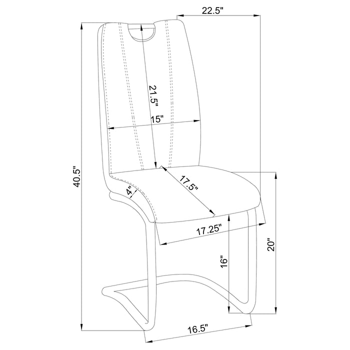 Give your entertainment area an ultra-modern feel with this five-piece dining table set. A spacious rectangular table with a gleaming high gloss white finish is supported by three stainless steel supports in a lustrous chrome finish that rest on a flush base that mirrors the top. With a pedestal-like design, the dining table invites each of the four cantilever style dining chairs to slide up for meals and conversations. Sit back and rest in the upholstered seats, wrapped in a two-tone gray and white leatherette that accents the contoured shapes. Mounted on a polished chrome metal base, the cantilever design chairs also offer an open, airy feel that showcases the table.