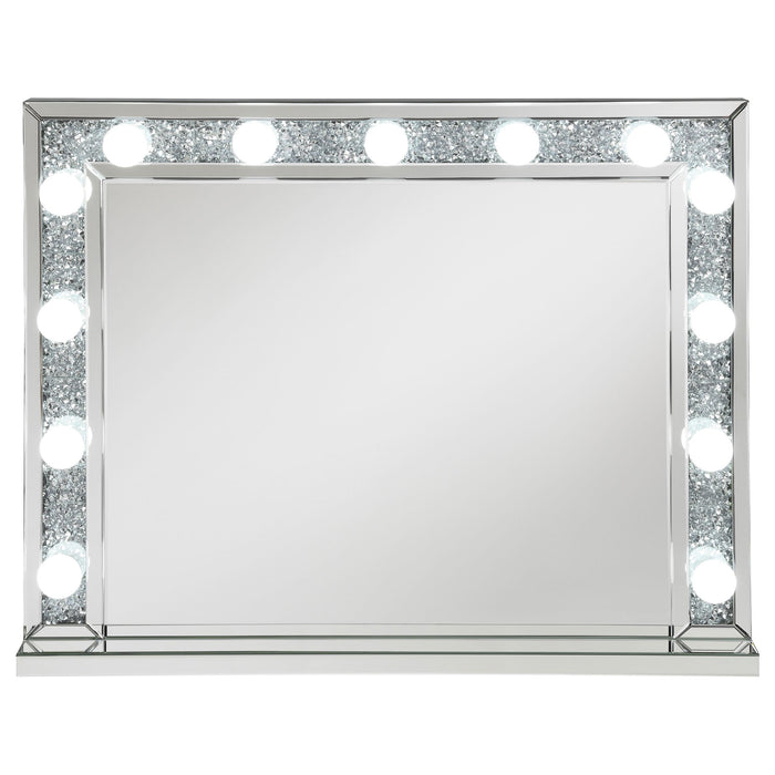 With a Hollywood regency flair, this table mirror is perfectly suited for a vanity tabletop. Place it above a vanity for a place to sit an apply makeup and more. With a rectangular shaped frame, filled with glimmering silver crystals and outlined in mirror paneling, this mirror offers all the luxe glam you need. As practical as it is glamorous, it offers a button switch power cord and over a dozen opaque white globe style bulbs for a retro-inspired look. Place this vanity mirror in a dressing area for a regal flair.