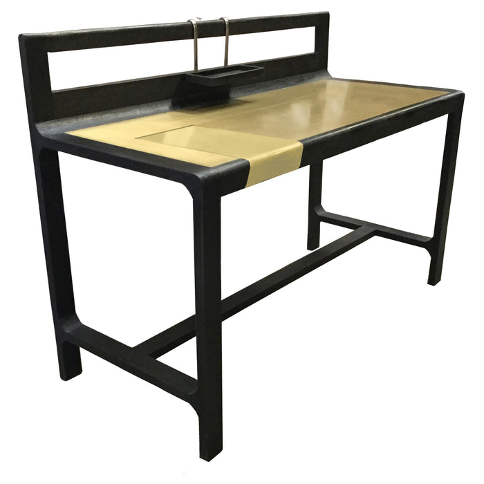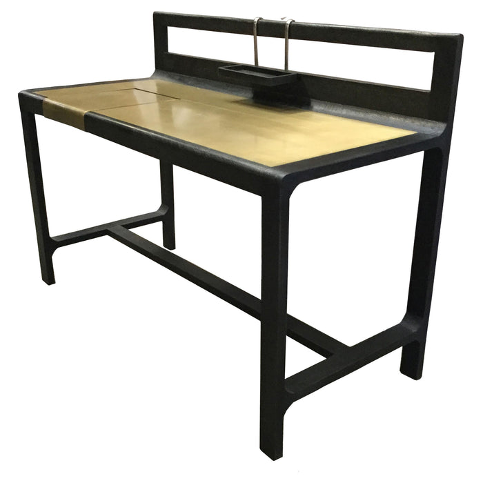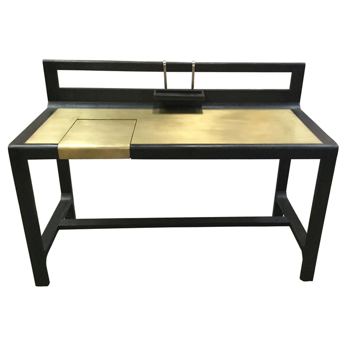 A sleek and minimalist black and brass writing desk immediately enhances your office. A brass accent strip enhances the appearance of the desk. Keep your laptop and other items neatly displayed on the expansive tabletop. The raised back features a cutout design for modern flair. This piece features an open and airy construction for a stylish office space.