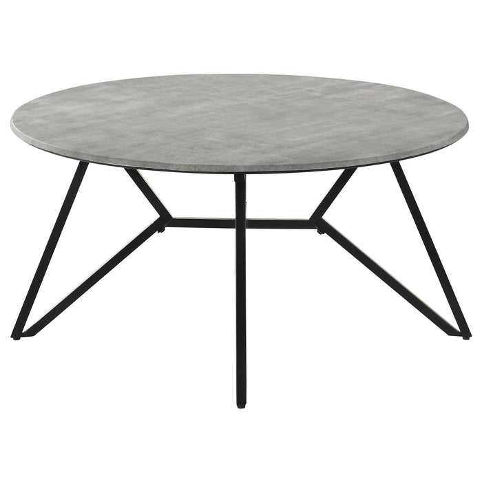 Gunmetal finish hairpin legs offer an industrial edginess to this modern coffee table. Designed with a faux cement top in an elegant round shape, this spacious cocktail table offers a casual, chic space to keep books, cocktails and more. The cement-like top even features a sandy feel for a hint of realist texture. Keep this coffee table in front of a mid-century modern sofa or allow it to take center stage in front of a sectional. Sculptural-like in itself, this coffee table looks stunning in a loft apartment and even lends a minimalist approach to homes.