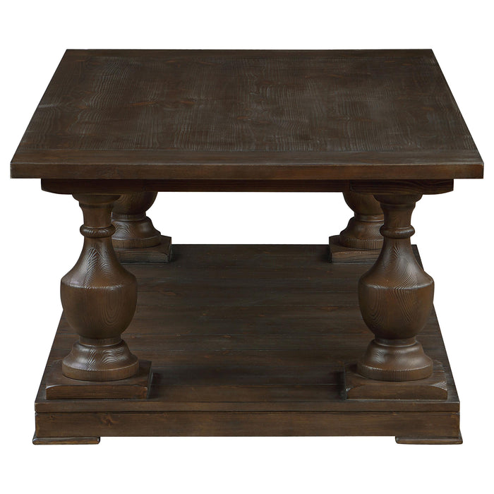 Traditional elements and a rich finish come together in this transitional coffee table. Built of a tropical wood, this coffee table presents a spacious rectangular designed with an open bottom shelf for displaying decor, books and more in the living room. Column-like turned pedestal legs lend a classic element as a plank design tabletop and other surfaces offer a rustic feel. In addition, the rich coffee brown wood finish offers a refined, traditional aesthetic. Place this sophisticated coffee table in front of a Chesterfield sofa or an oversized sectional.