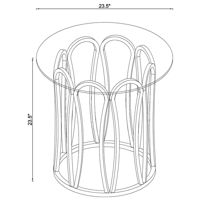 This coffee table set features a round design with clear tempered glass tops supported by sturdy metal frames. The frames are finished in electroplated chocolate chrome, delivering a sophisticated, deeper brass tone. The geometric base design on both tables adds a contemporary touch, while the tempered glass tops provide durability and easy maintenance. These tables offer functional elegance, making them an excellent addition to any living room or lounge area.