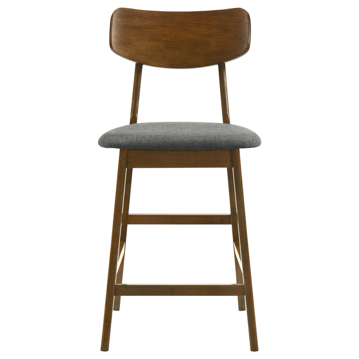 Create a warm and inviting breakfast nook with this charming five-piece modern counter height dining set. Centering on a 47-inch table, it boasts a rich walnut finish that lends timeless character and style. The table boasts angled fin-style legs that add dimension and character. Counter chairs offer plush comfort with foam-padded seats covered in inviting gray upholstery. Curved backrests and built-in footrests complete the design and offer incredible comfort, perfect for quick bites and leisurely dining.