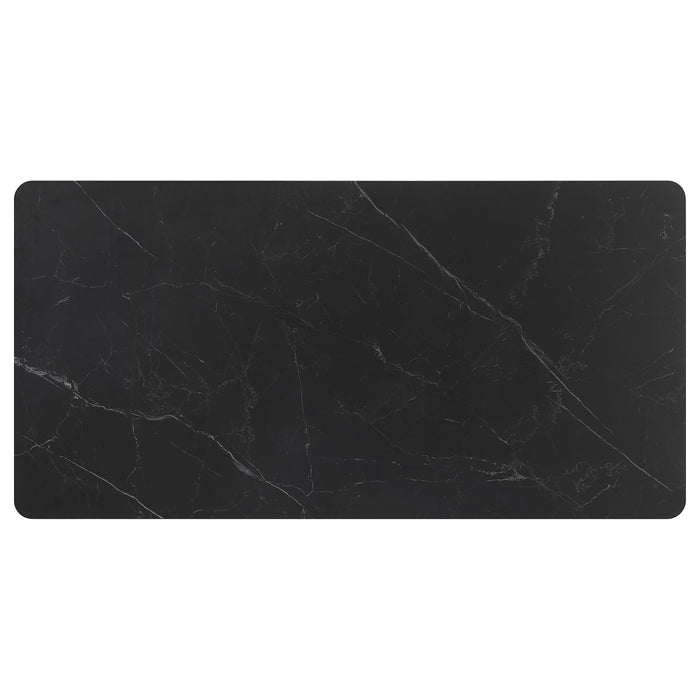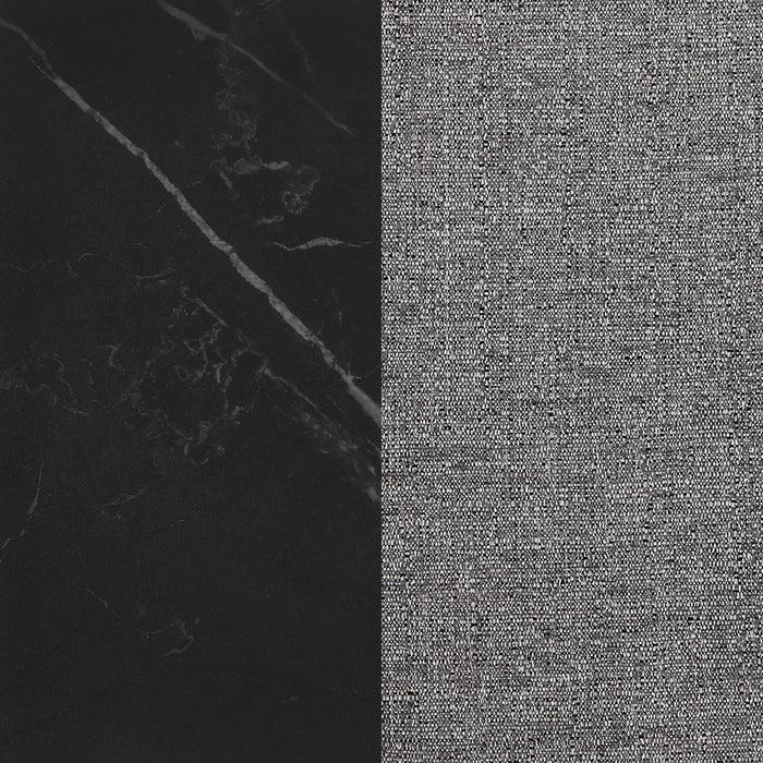 Elevate your dining experience with the stunning five-piece dining table set that seamlessly blends modern elegance with mid-century charm. The 71-inch dining table features a sleek black ceramic top with delicate white striations, creating a marble-like masterpiece perfect for any stylish home. Complementing this table are four upholstered side chairs, each wrapped in sophisticated grey fabric and supported by tapered gunmetal legs for a contemporary touch. This set promises to be the centerpiece of your dining room, offering both ample seating and unparalleled style. Transform everyday meals into extraordinary moments with this exquisite dining ensemble.
