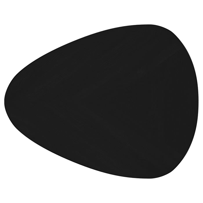 Introduce a modern flair to your living room or den with this sleek wooden end table. Finely crafted from solid mango wood, its deep black finish enhances its timeless elegance. The triangular tabletop features rounded corners, lending a softened, contemporary vibe. Supported by three tapering, splayed legs, the design exudes a light and airy feel. Perfect for flanking a sofa or armchair, this side table is ideal for showcasing a reading lamp or decorative accents.