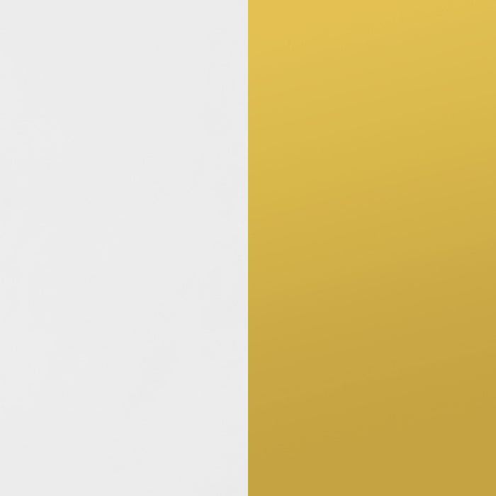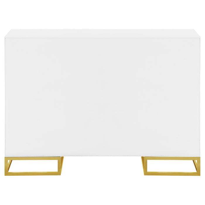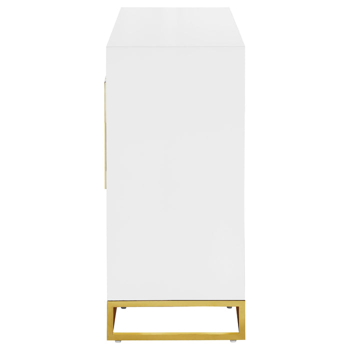 Add a bold statement piece to your space with this stunning modern accent cabinet. Featuring a glossy white finish with lustrous gold stainless steel trim, it showcases Art Deco flair with clean lines and geometric base supports. Behind double doors, adjustable shelves offer customizable storage. Crafted from durable MDF and stainless steel, this cabinet blends glamour and function beautifully in any setting.