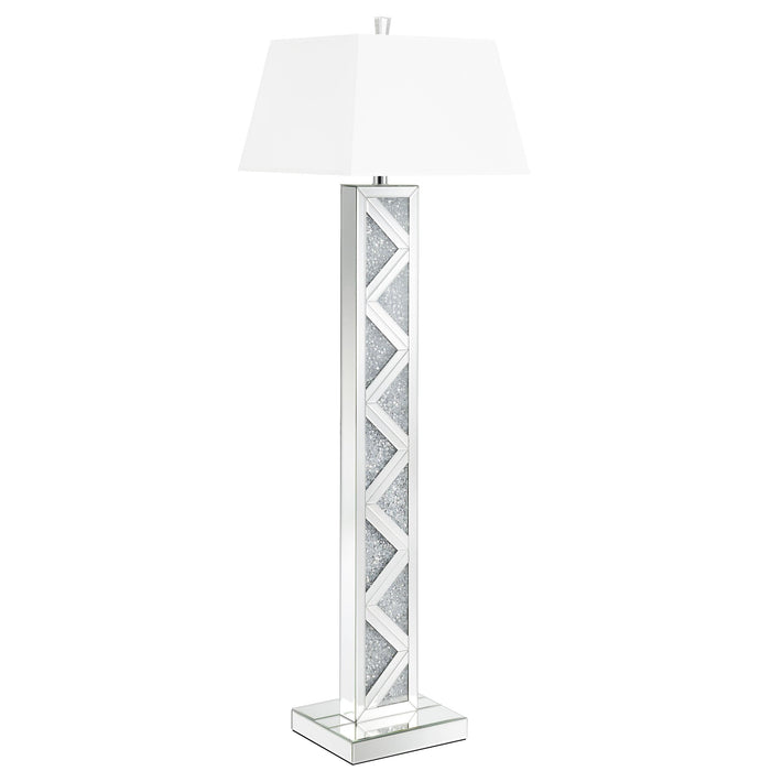 Bring bold glamour to your interior with this contemporary floor lamp, featuring a mirrored base adorned with sparkling crystal-like accents in a striking geometric pattern. A crisp white fabric shade adds contrast and diffuses soft ambient light. Perfect for modern living rooms or chic bedrooms, this lamp doubles as a dazzling décor statement.