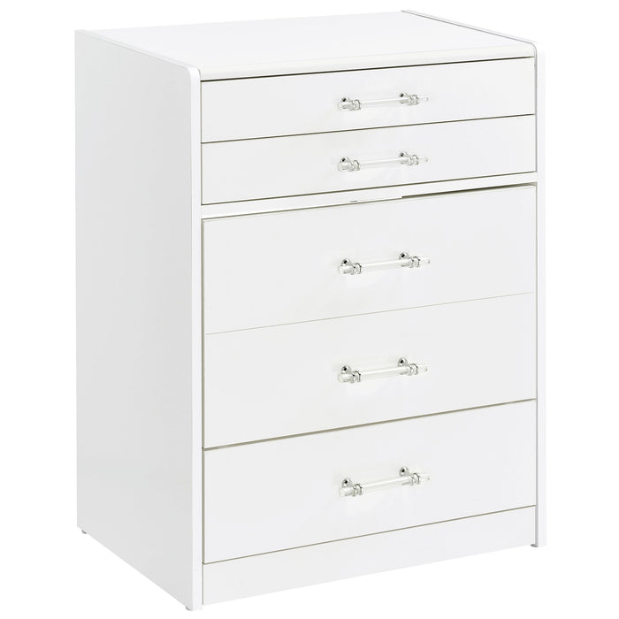This high gloss makeup vanity set, crafted from engineered wood with eco-friendly laminate, blends seamlessly into your bedroom, doubling as a chic chest of drawers. The flip-top vanity mirror with LED lighting offers perfect illumination, while built-in dual USB outlets (Type A and Type C) allow for convenient device charging. The clear glass tabletop reveals a compartmentalized drawer for easy organization, and the cushioned vanity chair includes extra storage. Clear acrylic and chrome pull handles add a modern, elegant touch.