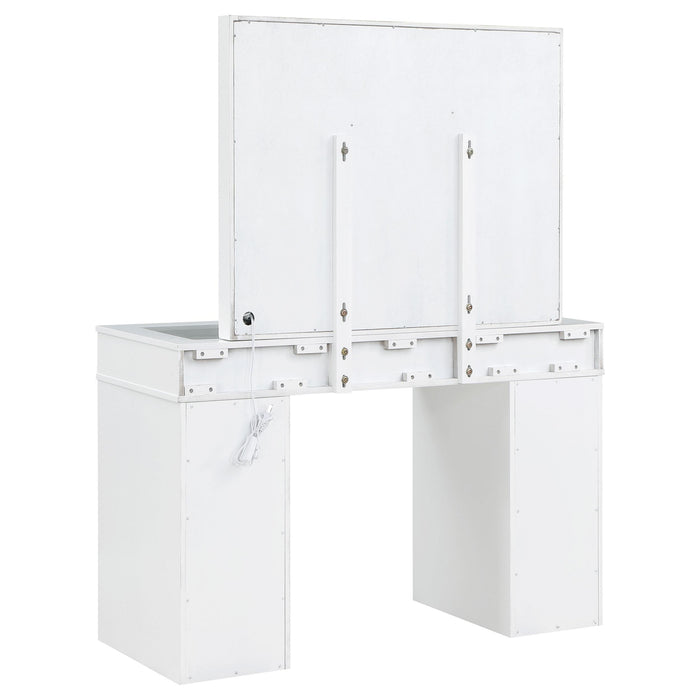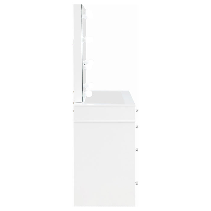 Pull out all the stops to set up a stylish and functional space for your makeup and prep, adding this three-piece white finish vanity set to a modern bedroom. Wood products construction with mirrored drawer fronts and a gray upholstered stool cushion team up to maintain an easy palette with versatility. Find space in nine drawers to stash implements, cosmetics, and accessories. Charming crystal knobs and a felt-lined top drawer add to a list of fab features. The marquee element of this set is a mirror surrounded with bulbs to offer helpful lighting as it enhances a chic design.