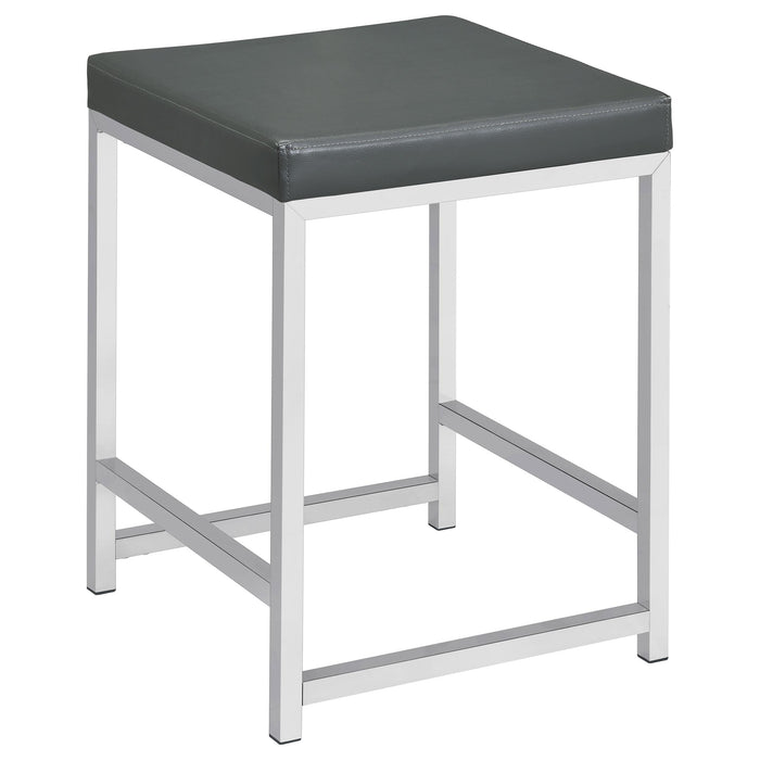 Rest comfortably in this chic contemporary vanity stool as you apply makeup or prepare for the day. Featuring a square shape design and a densely padded, foam-filled cushion , this modern stool provides a spacious for long-lasting comfort. The seat cushion is also wrapped entirely in a smooth grey tone leatherette. With a backless design, you can slide it beneath a vanity table when not in use. The base offers all the support you need with a heavy gauge steel frame with a gleaming electroplated, polished chrome finish.